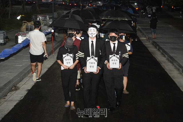 조국 법무부 장관 후보자의 인사청문회가 열린 6일 오후 고려대 학생들이 서울 성북구 고려대학교 민주광장에서 열린 조 후보자 딸의 '입시비리 의혹 진상 규명 촉구 3차 촛불집회'에서 '기회의 평등·과정의 공정·결과의 정의'라는 문구가 적힌 영정사진을 들고 가두행진을 하고 있다.