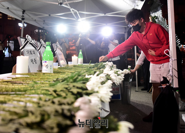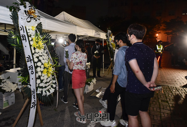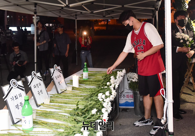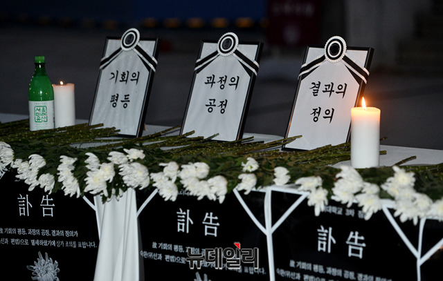 조국 법무부 장관 후보자의 인사청문회가 열린 6일 오후 고려대학교 학생들이 서울 성북구 고려대학교 민주광장에서 열린 조 후보자 딸의 '입시비리 의혹 진상 규명 촉구 3차 촛불집회'에서 '기회의 평등·과정의 공정·결과의 정의'가 죽었다는 의미로 헌화를 하고 있다.