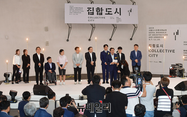박원순 서울시장, 변요한 홍보대사, 서울시 명예시장 등 참가자들이 7일 오후 서울 중구 동대문디자인플라자에서 진행된 '2019 서울도시건축 비엔날레' 개막식에서 개막을 알리는 퍼포먼스를 하고 있다.'집합도시(Collective City)'를 주제로 7일부터 개막하는 '2019 서울도시건축 비엔날레'는 동대문디자인플라자(DDP)를 중심으로 돈의문박물관마을, 서울도시건축전시관, 세운상가, 서울역사박물관 등 서울 도심에서 11월 10일까지 65일간 열린다.