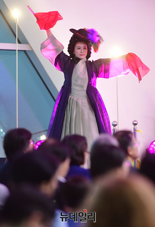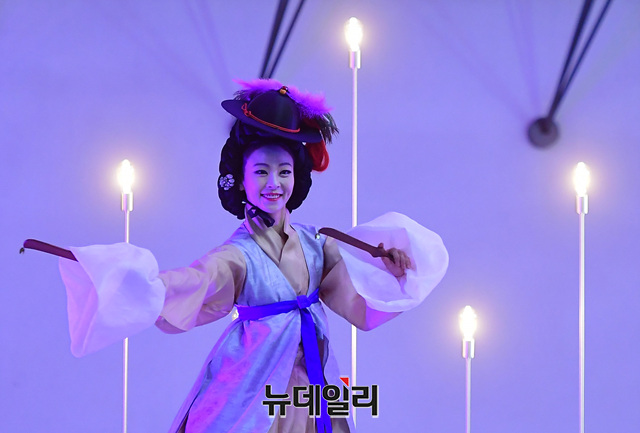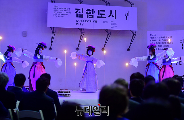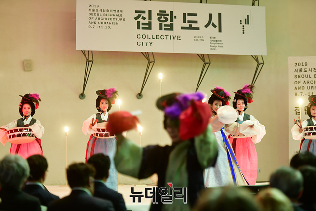서평도락 환영공영단이 7일 오후 서울 중구 동대문디자인플라자에서 열린 '2019 서울도시건축 비엔날레' 개막식에 앞서 평양검기무 환영공연 무대를 하고 있다.