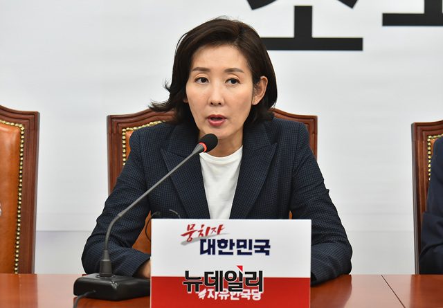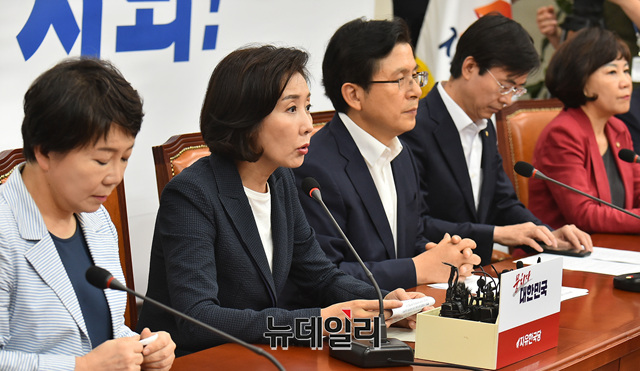 나경원 자유한국당 원내대표가 8일 오후 국회에서 열린 긴급최고위원회의에 참석해 모두발언하고 있다.