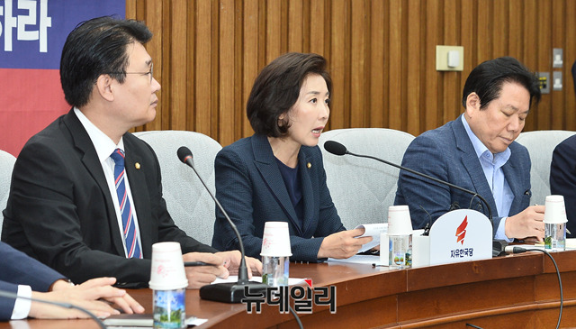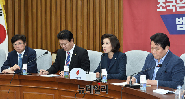 나경원 자유한국당 원내대표가 10일 오전 국회에서 열린 원내대책회의에서 모두발언을 하고 있다.