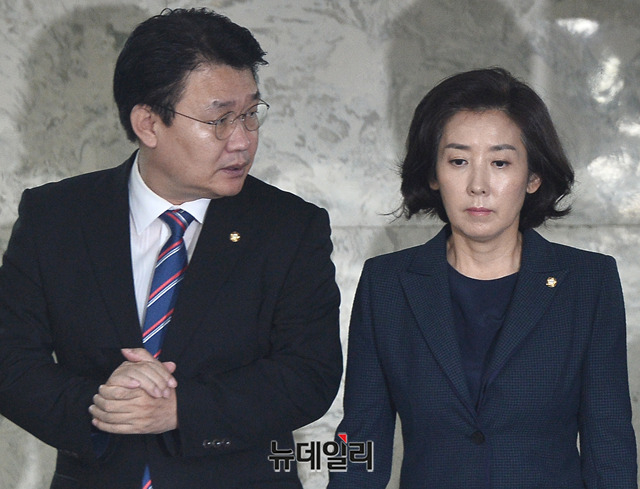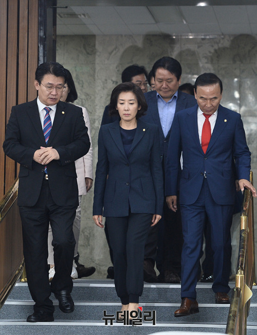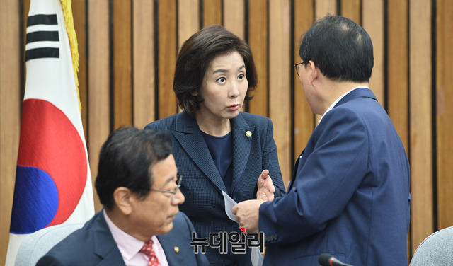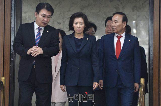 나경원 자유한국당 원내대표, 정용기 정책위의장 및 지도부가 10일 오전 국회에서 열린 원내대책회의에 입장하고 있다.