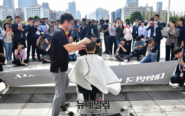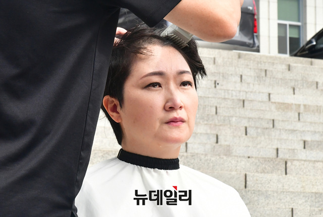 이언주 무소속 의원이 10일 오전 국회 본청 계단 앞에서 조국 법무부장관 임명 규탄 삭발을 했다.