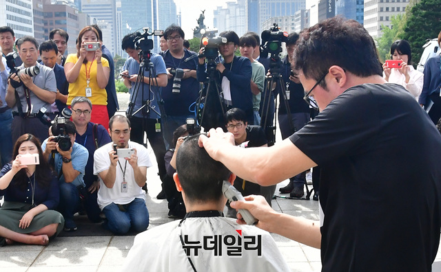이언주 무소속 의원이 10일 오전 국회 본청 계단앞에서 조국 법무부장관 임명 규탄 삭발식을 하고 있다.