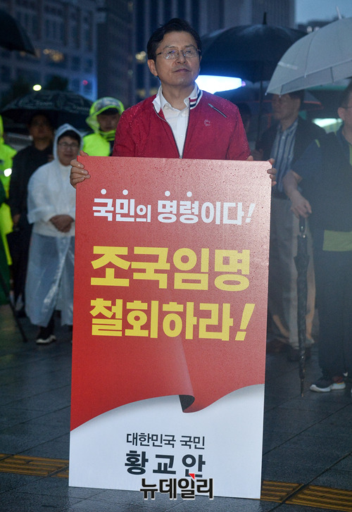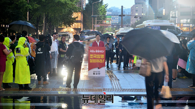 [포토] 빗속 '조국 임명 철회' 1인시위하는 황교안