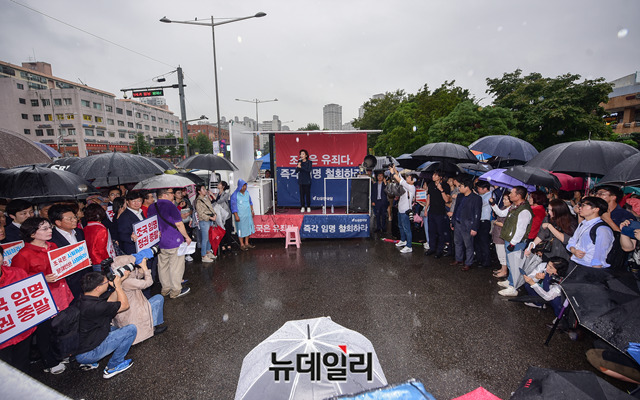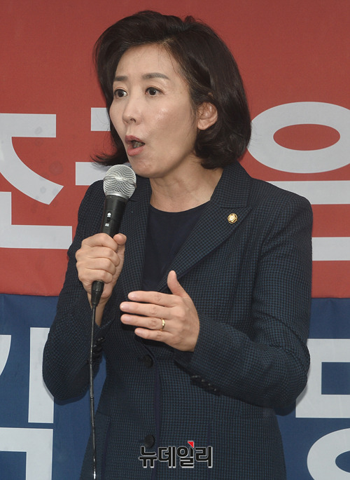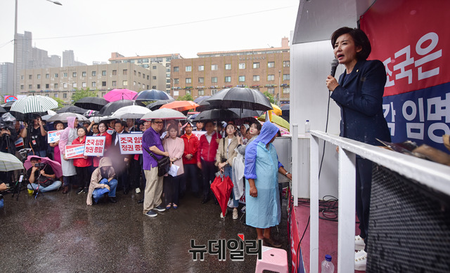 나경원 자유한국당 원내대표가 10일 오후 서울 서초구 반포지구대 옆 광장에서 열린 '살리자 대한민국 문재인정권 순회 규탄대회'에서 모두발언을 하고 있다.