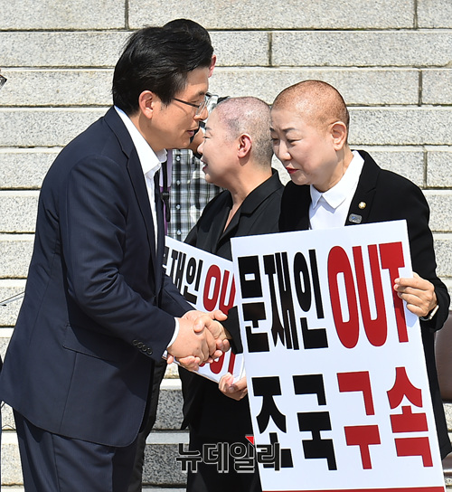 황교안 자유한국당 대표가 11일 오전 국회 본청 계단에서 조국 법무부 장관 해임을 요구하며 삭발한 박인숙 의원을 격려하고 있다.