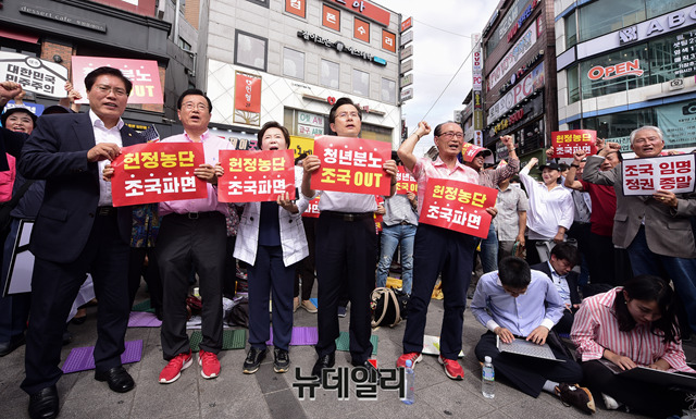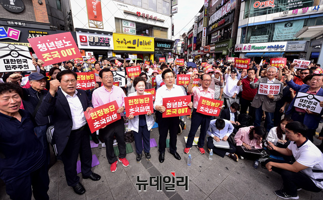 황교안 자유한국당 대표, 정미경 최고위원 및 한국당 의원, 시민들이 11일 오전 경기 수원시 수원역 인근에서 열린 '살리자 대한민국 문재인정권 순회 규탄대회'에서 구호를 외치고 있다. (경기 수원=박성원 기자)
