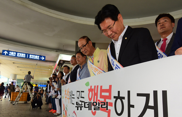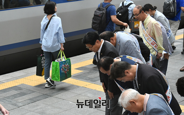 [포토] 귀성객들에게 인사하는 홍문종 우리공화당 공동대표