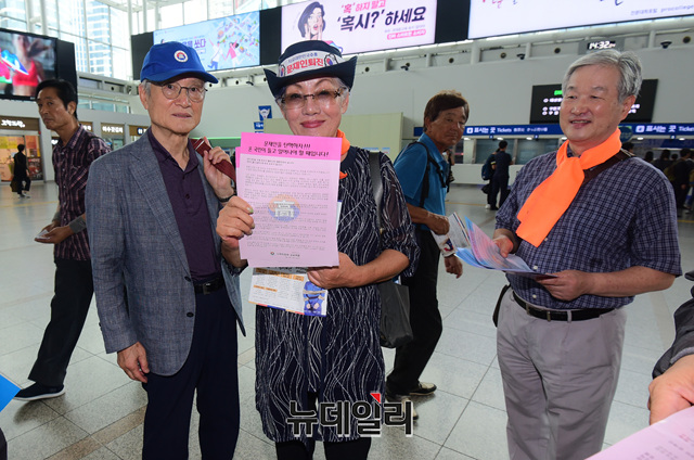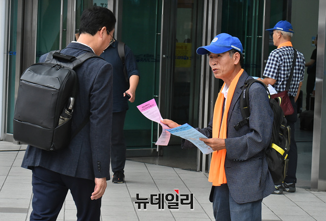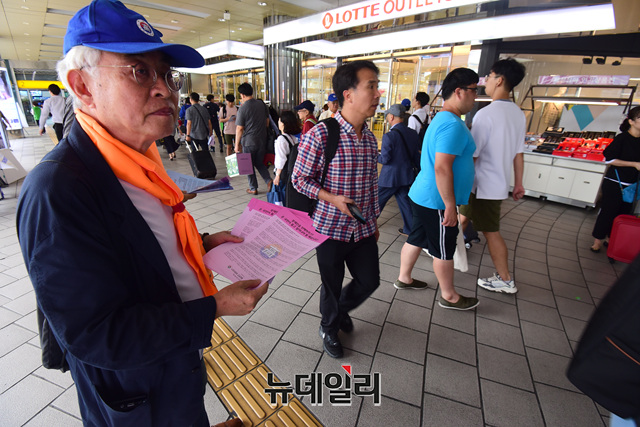 추석 연휴를 하루 앞둔 11일 오후 나라지킴이 고교연합 회원들이 서울역 인근에서 문재인 대통령과 조국 법무부 장관을 규탄하는 전단지를 귀성객들에게 배포 하고 있다.
