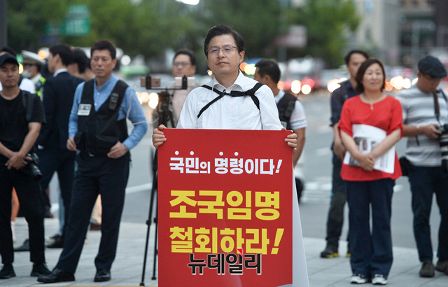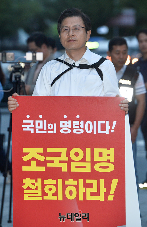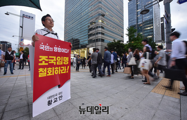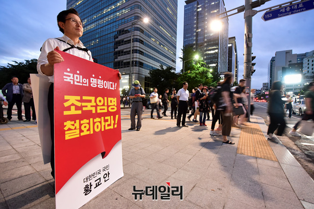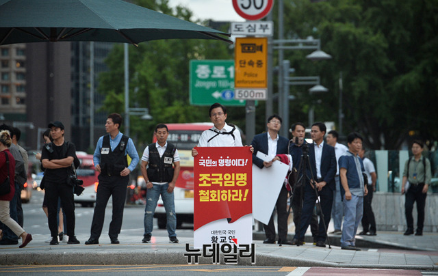 황교안 자유한국당 대표가 11일 오후 서울 광화문 광장에서 조국 신임 법무부 장관의 임명철회를 요구하는 1인 시위를 하고 있다. 앞서 황 대표는 인천 부평, 경기 수원·분당에서 각각 문재인 정권 규탄대회를 가졌다.
