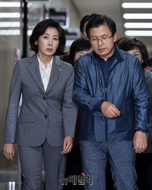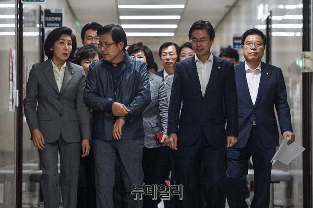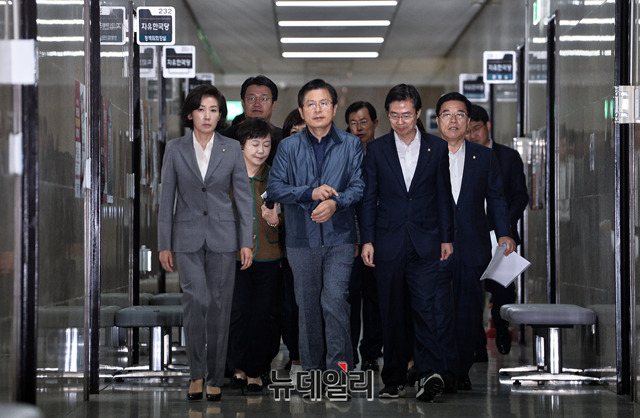 황교안 자유한국당 대표, 나경원 원내대표, 조경태 최고위원 및 지도부가 16일 오전 국회에서 열린 최고위원회의에 입장하고 있다.