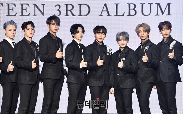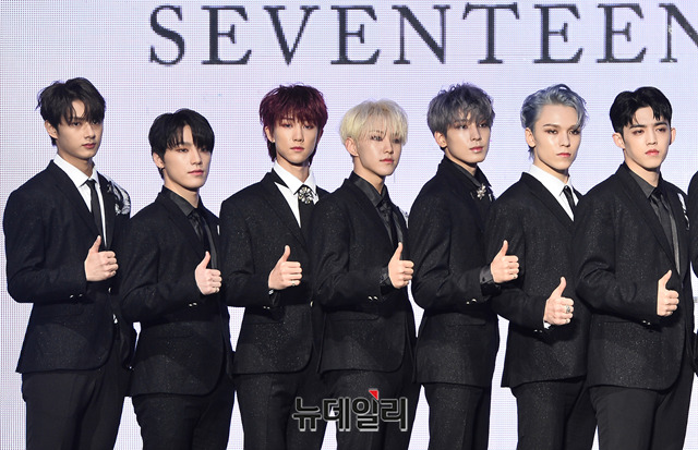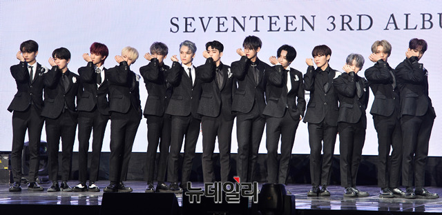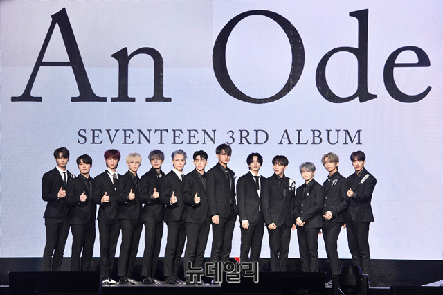 아이돌그룹 세븐틴(Seventeen)이 16일 오후 서울 성북구 고려대학교 화정체육관에서 열린 세 번째 앨범 '언 오드(An Ode)' 쇼케이스에서 포토타임을 갖고 있다.