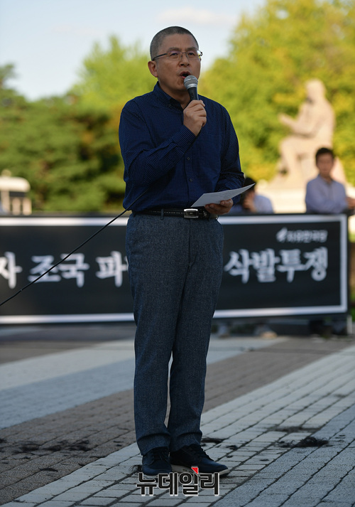 황교안 자유한국당 대표가 16일 오후 청와대 앞 분수대에서 문재인 정권의 헌정유린 중단과 조국 신임 법무부 장관의 파면을 요구하며 삭발투쟁을 강행했다.