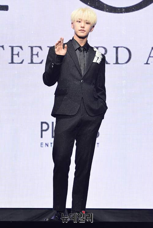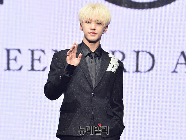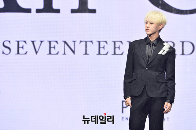 아이돌그룹 '세븐틴(Seventeen)' 호시가 16일 오후 서울 성북구 고려대학교 화정체육관에서 열린 세 번째 앨범 '언 오드(An Ode)' 쇼케이스에서 포토타임을 갖고 있다.