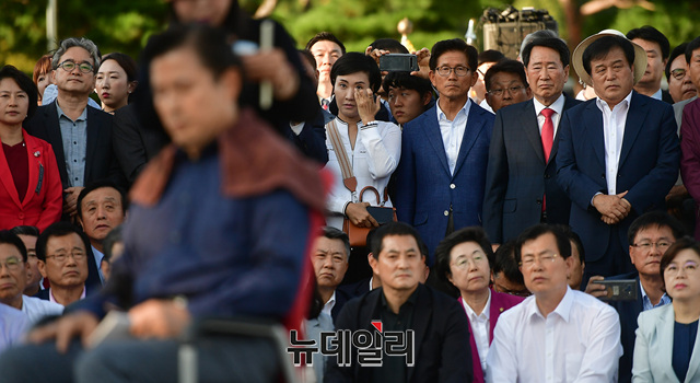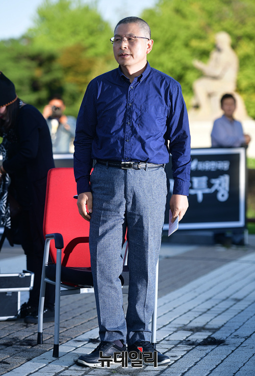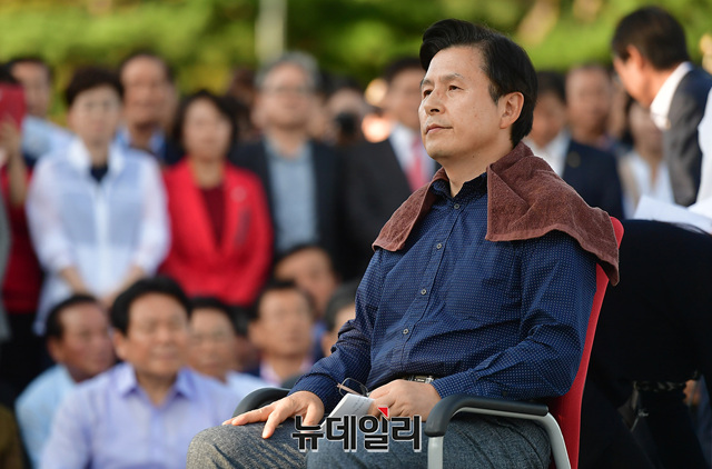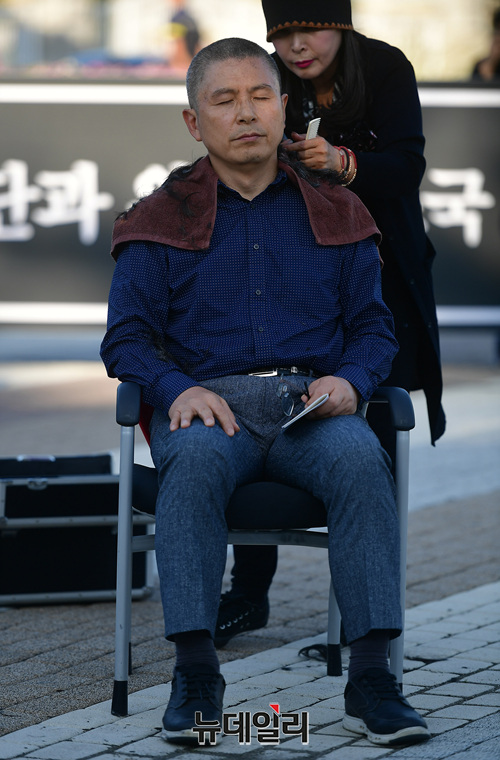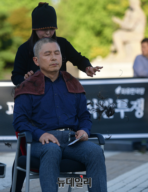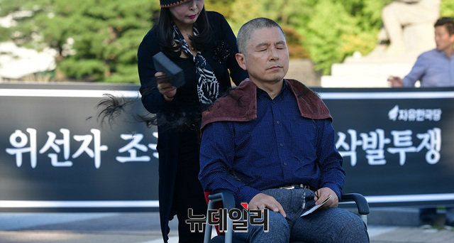 황교안 자유한국당 대표가 16일 오후 청와대 앞 분수대에서 문재인 정권의 헌정유린 중단과 조국 신임 법무부 장관의 파면을 요구하며 삭발을 하고 있다. 황 대표의 삭발식이 진행되는 동안 한국당 의원과 당직자들은 애국가를 부르며 응원했다.