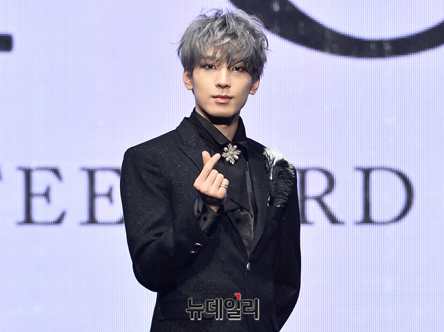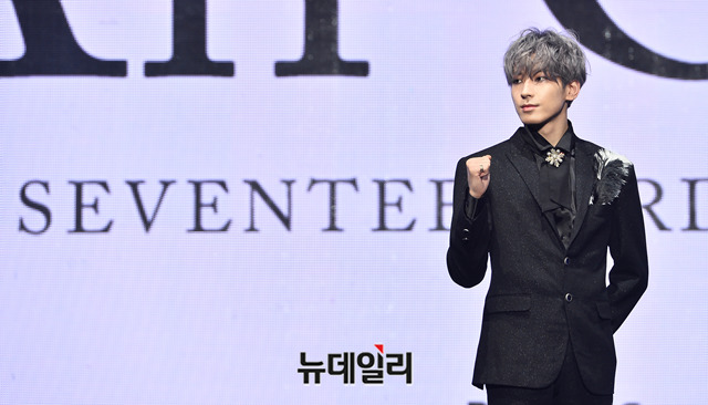 아이돌그룹 '세븐틴(Seventeen)' 원우가 16일 오후 서울 성북구 고려대학교 화정체육관에서 열린 세 번째 앨범 '언 오드(An Ode)' 쇼케이스에서 포토타임을 갖고 있다.