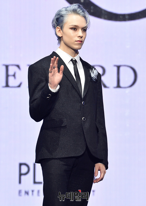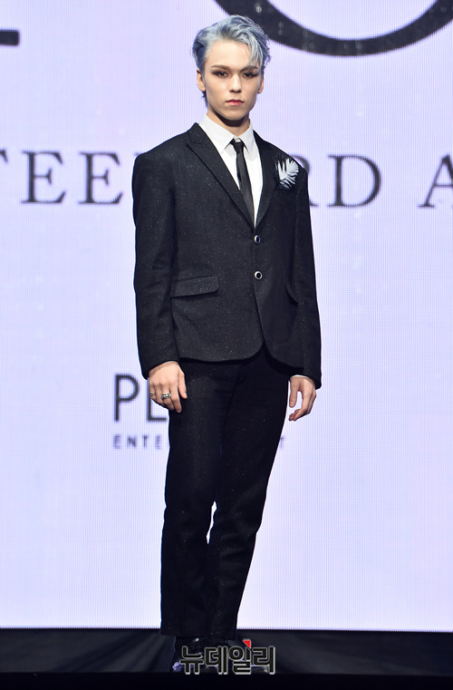 아이돌그룹 '세븐틴(Seventeen)' 버논이 16일 오후 서울 성북구 고려대학교 화정체육관에서 열린 세 번째 앨범 '언 오드(An Ode)' 쇼케이스에서 포토타임을 갖고 있다.