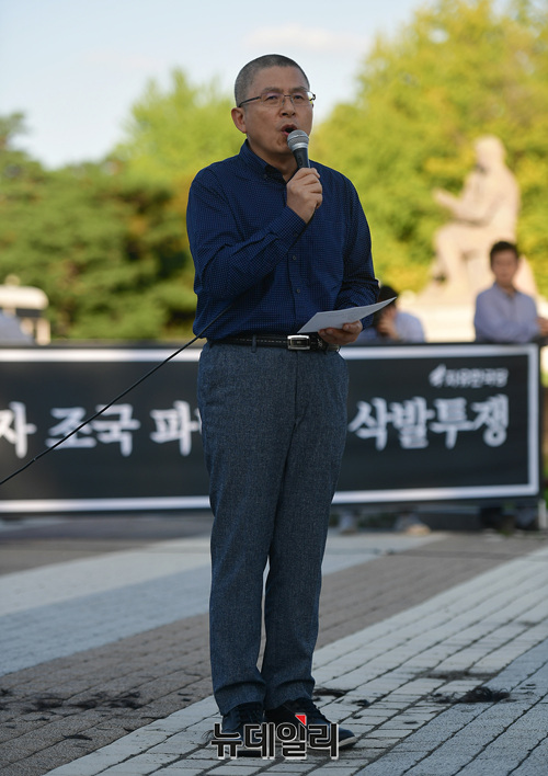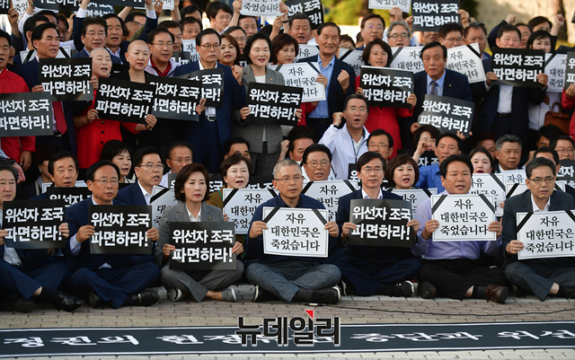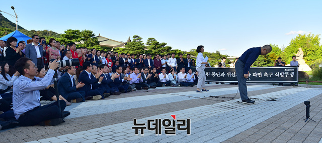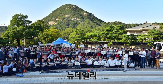 황교안 자유한국당 대표와 소속당 의원들이 16일 오후 청와대 앞 분수대에서 열린 문재인 정권의 헌정유린 중단과 조국 신임 법무부 장관의 파면을 요구하는 기자회견에서 구호를 외치고 있다. 이날 황 대표는 삭발식을 갖고, 국민들에게 함께 싸워달라고 했다.