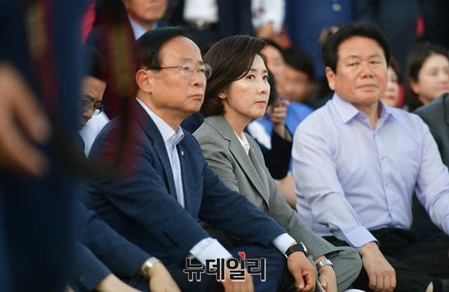 나경원 자유한국당 원내대표가 16일 오후 청와대 앞 분수대에서 문재인 정권의 헌정유린 중단과 조국 신임 법무부 장관의 파면을 요구하는 황교안 한국당 대표의 삭발식을 지켜보고 있다. 삭발식이 진행되는 동안 한국당 의원과 당직자들은 애국가를 부르며 응원했다.