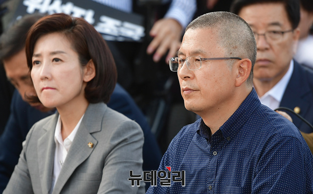 황교안 자유한국당 대표와 나경원 원내대표가 16일 오후 청와대 앞 분수대광장에서 삭발식 직후 연좌농성을 이어가고 있다.