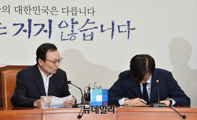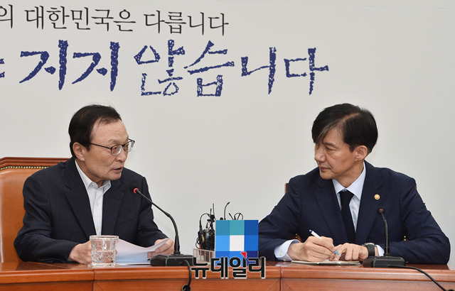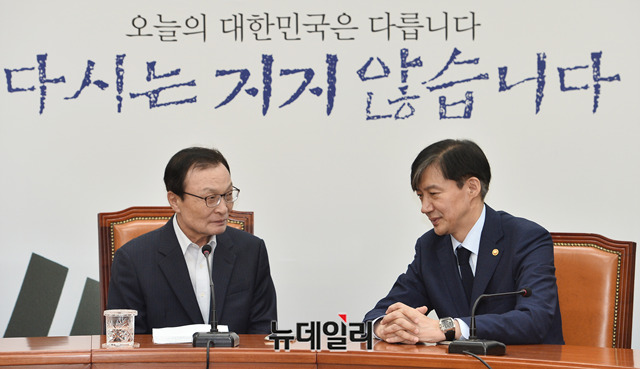 조국 신임 법무부장관이 17일 오전 국회에서 이해찬 더불어민주당 대표를 예방하고 환담을 나누고 있다.