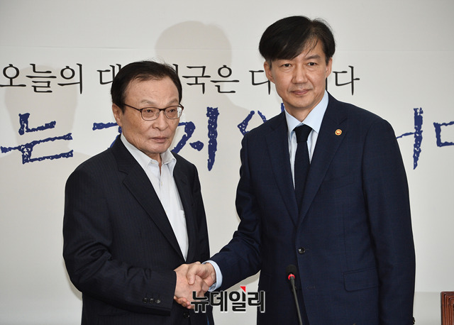 조국 신임 법무부장관이 17일 오전 국회에서 이해찬 더불어민주당 대표를 예방하고 악수를 나누고 있다.