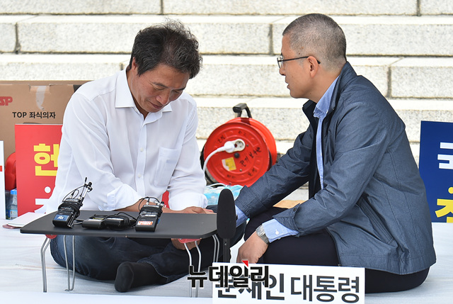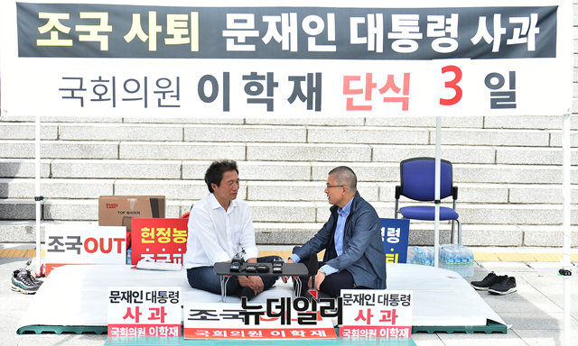 황교안 자유한국당 대표가 17일 오전 국회 본청계단 앞에서 조국 법무부 장관의 임명 철회를 요구하며 단식에 들어간 이학재 의원을 찾아 격려하고 있다.