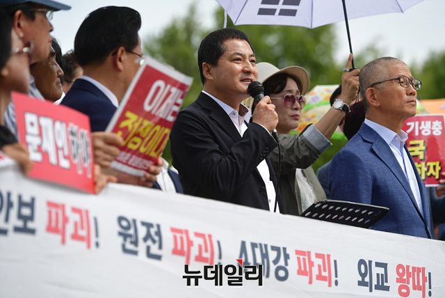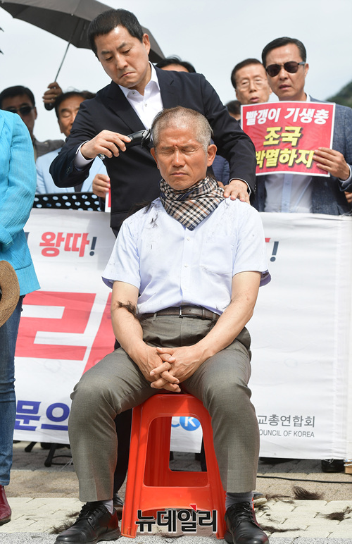 박대출 자유한국당 의원이 17일 오전 청와대 분수대 광장에서 진행된 김문수 전 경기지사의 삭발식 직후 발언하고 있다. 박 의원은 지난 4월 패스트트랙 강행에 반발하며 자진 삭발을 했다. 이날 김 전 지사의 삭발을 도왔다.