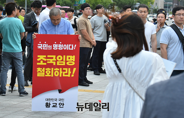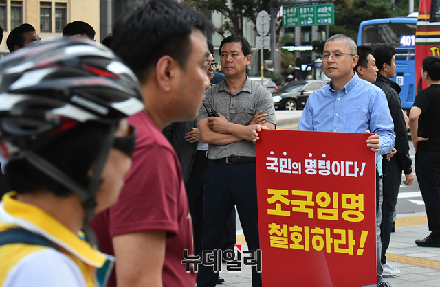 황교안 자유한국당 대표가 17일 오후 서울 종로구 세종대로사거리에서 '조국 장관 사퇴 촉구 1인 시위'를 하고 있다.