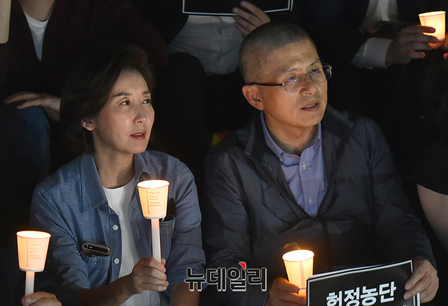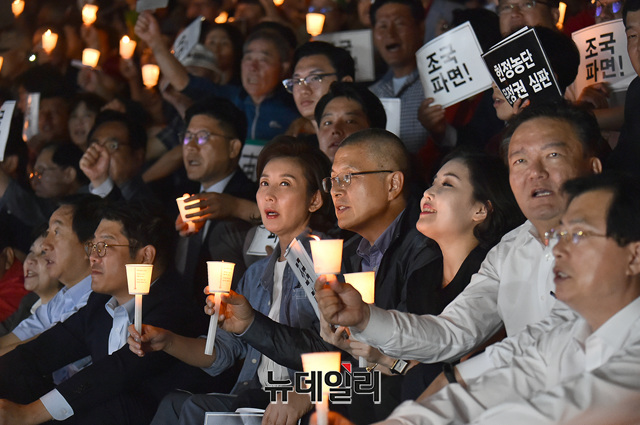 황교안 자유한국당 대표와 나경원 원내대표가 17일 오후 서울 종로구 세종문화회관 에서 열린 '조국 법무부 장관 파면 촉구 촛불집회'에 참석해 규탄구호를 외치고 있다.
