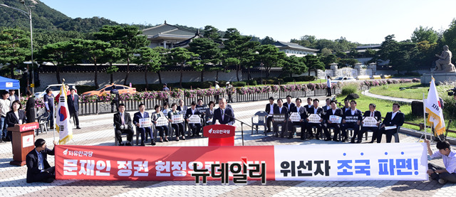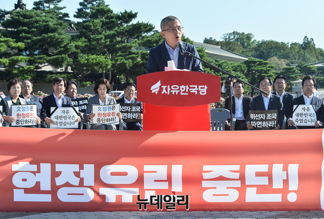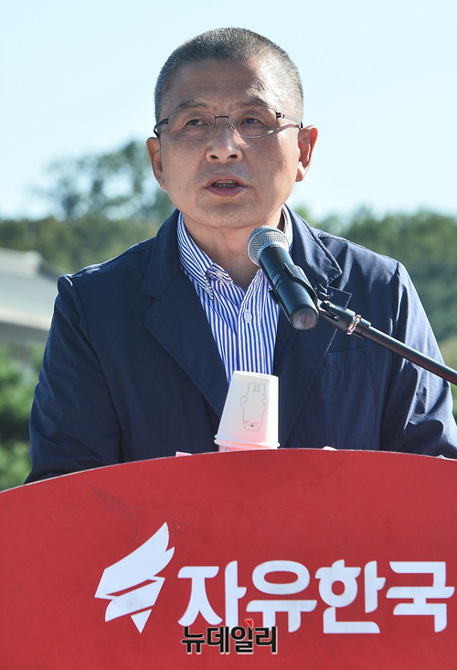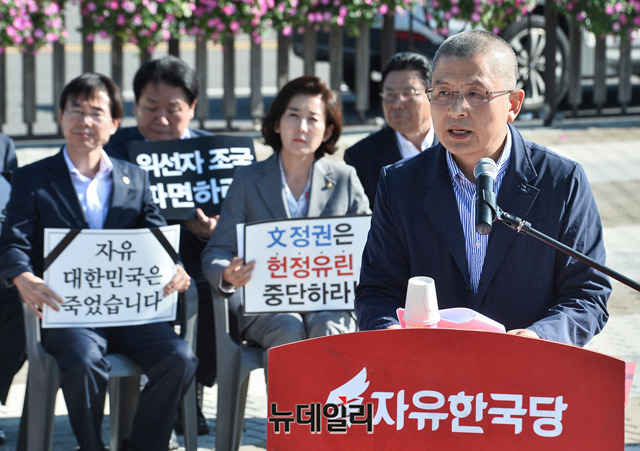 황교안 자유한국당 대표가 18일 오전 청와대 앞 분수대광장에서 열린 당대표 및 최고위원·중진의원 연석회의에서 모두발언을 하고 있다.
