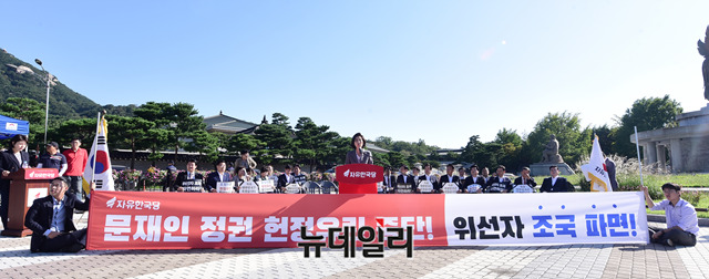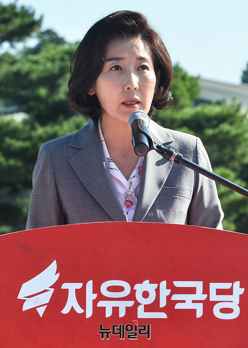 나경원 자유한국당 원내대표가 18일 오전 청와대 앞 분수대광장에서 열린 당대표 및 최고위원·중진의원 연석회의에서 모두발언을 하고 있다.