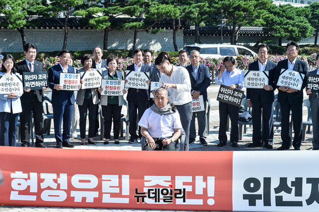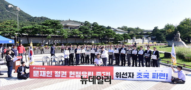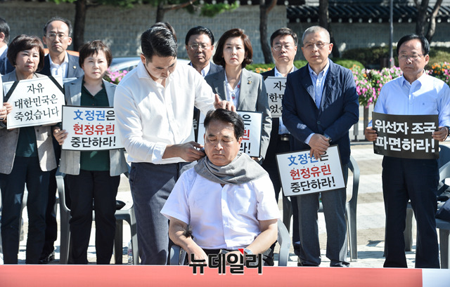 심재철 자유한국당 의원이 18일 오전 청와대 앞 분수대광장에서 열린 당대표 및 최고위원·중진의원 연석회의를 마친 직후 문재인 정권의 헌정유린 중단과 조국 신임 법무부 장관의 파면을 요구하며 삭발을 하고 있다. 이날 이주영 의원도 삭발에 동참했다.