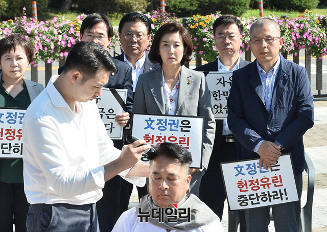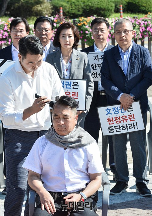 황교안 자유한국당 대표와 나경원 원내대표가 18일 오전 청와대 앞 분수대광장에서 문재인 정권의 헌정유린 중단과 조국 신임 법무부 장관의 파면을 요구하는 심재철 의원의 삭발식을 바라보고 있다.