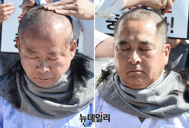 이주영(왼쪽)·심재철 자유한국당 의원이 18일 오전 청와대 앞 분수대광장에서 진행된 한국당 연석회의 직후 문재인 정권의 헌정유린 중단과 조국 신임 법무부장관의 파면을 요구하며 삭발을 강행했다.