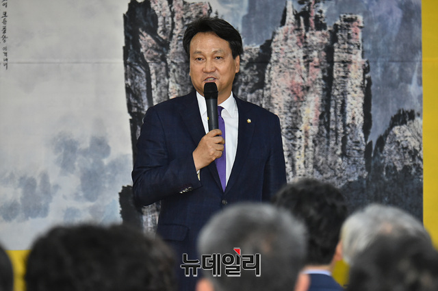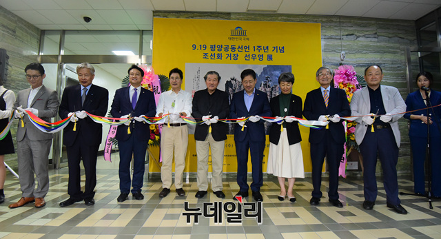 안민석 국회 문화체육관광위원회 위원장 등 참석자들이 18일 오후 국회에서 열린 '대한민국 국회 9·19 평양공동선언 1주년 기념, 거장 선우영' 전시회에 참석해 테이프 커팅을 하고 있다.