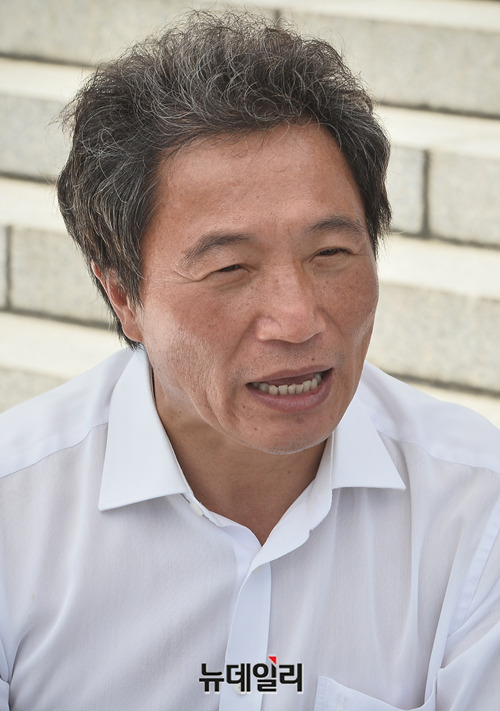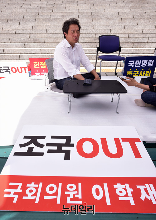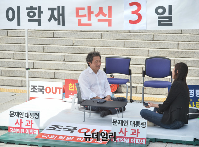 조국 법무부 장관 퇴진을 요구하며 단식투쟁을 이어가고 있는 이학재 자유한국당 의원이 17일 오후 국회 본관 계단 앞 농성장에서 뉴데일리와 인터뷰를 갖고 있다.
