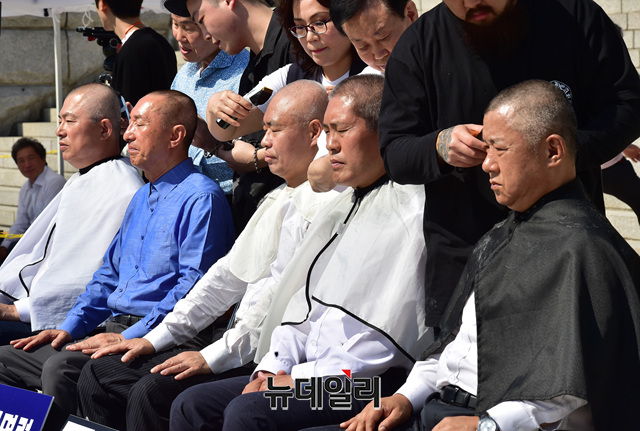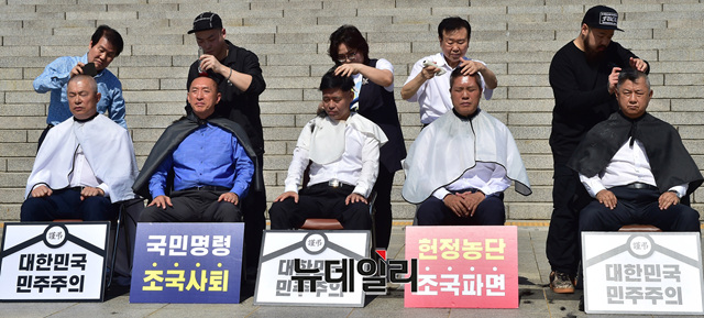 자유한국당 송석준·김석기·이만희·장석춘·최교일 의원이 19일 오전 국회 본관 앞 계단에서 조국 법무부 장관 사퇴를 촉구하며 삭발식을 갖고 있다.