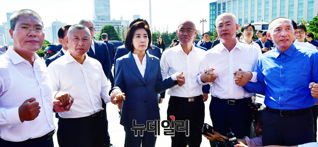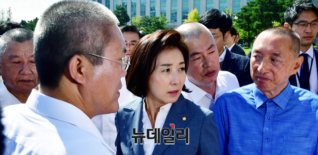 나경원 자유한국당 원내대표가 19일 오전 국회 본관 앞 계단에서 열린 '조국 법무부 장관 사퇴 촉구 삭발식'을 마친 송석준·김석기·이만희·장석춘·최교일 의원을 격려하고 있다.