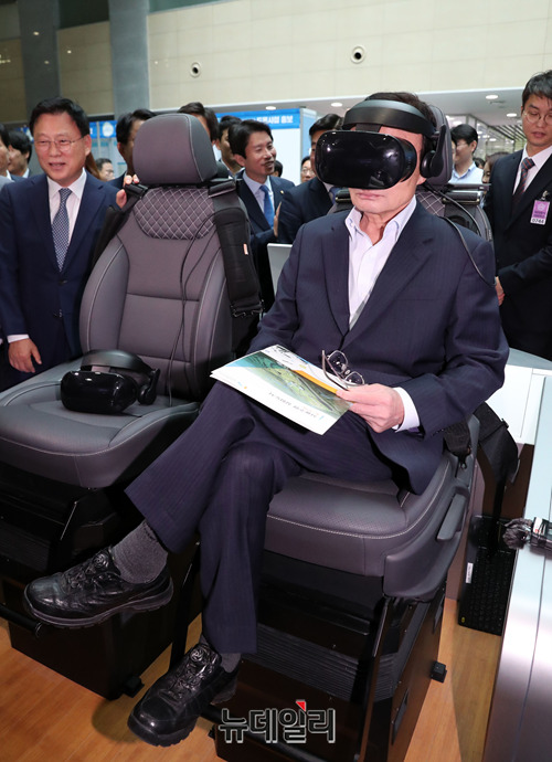 이해찬 더불어민주당 대표가 20일 오전 국회 의원회관에서 열린 '더불어 2019 정책페스티벌' 개막식에 참석해 자율주행 자동차 시뮬레이터를 체험하고 있다.