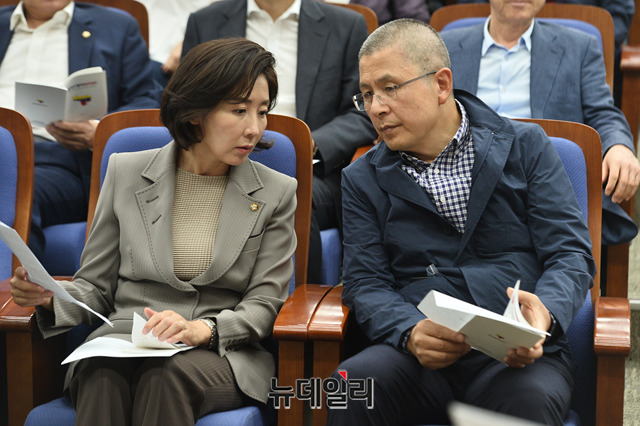 황교안 자유한국당 대표와 나경원 원내대표가 20일 오전 국회에서 열린 베네수엘라 리포트위원회 활동 보고회에서 대화를 하고 있다.
