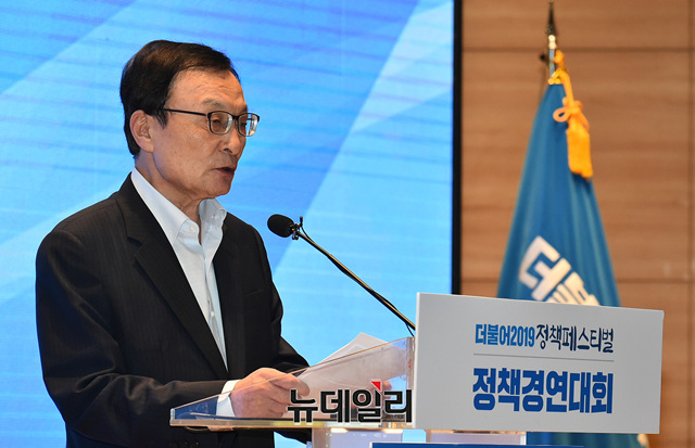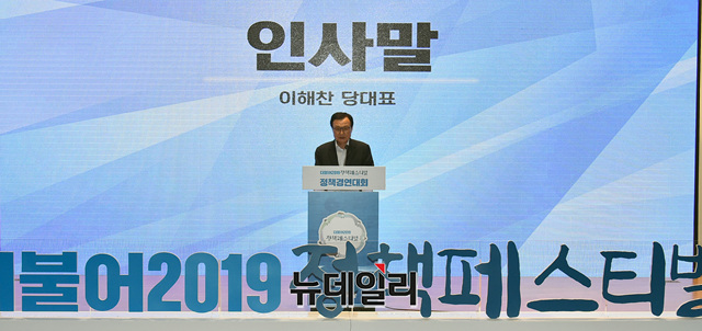 이해찬 더불어민주당 대표가 20일 오후 국회 의원회관에서 열린 민주당 2019 정책페스티벌 정책경연대회에서 인사말을 하고 있다.