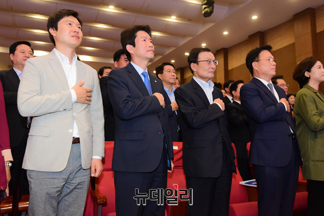 이해찬 더불어민주당 대표, 이인영 원내대표 및 참석자들이 20일 오후 국회 의원회관에서 열린 민주당 2019 정책페스티벌 정책경연대회에서 국민의례를 하고 있다.