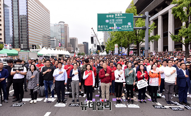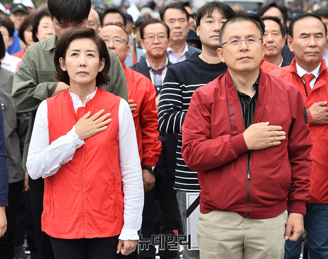 황교안 자유한국당 대표, 나경원 원내대표와 참가자들이 21일 오후 서울 광화문광장에서 열린 '文정권 헌정유린 중단과 위선자 조국파면' 촉구 대회에 앞서 국민의례를 하고 있다.