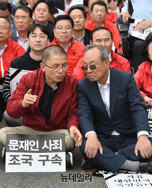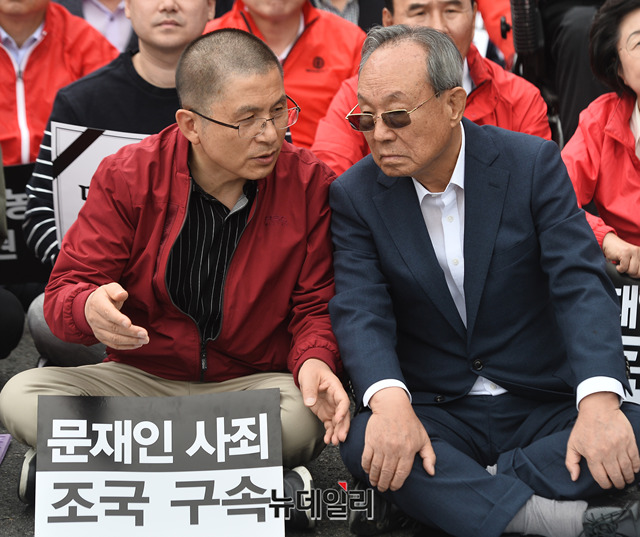 황교안 자유한국당 대표와 박관용 전 국회의장이 21일 오후 서울 광화문광장에서 열린 '文정권 헌정유린 중단과 위선자 조국파면' 촉구 대회에서 대화를 나누고 있다.