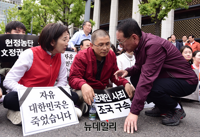 황교안 자유한국당 대표, 나경원 원내대표, 김도읍 의원이 21일 오후 서울 광화문광장에서 열린 '文정권 헌정유린 중단과 위선자 조국파면' 촉구 대회에서 대화를 나누고 있다.