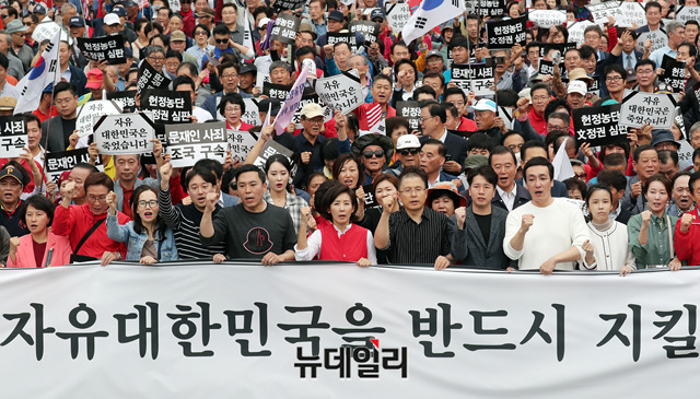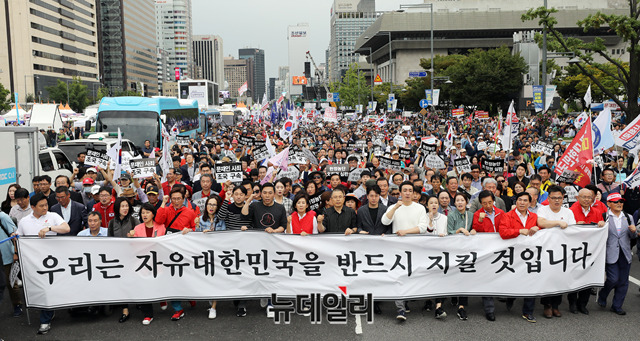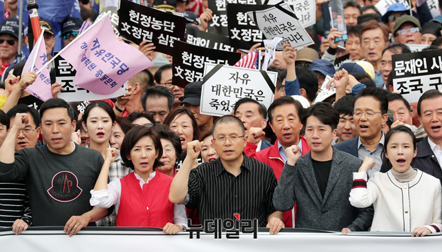 황교안 자유한국당 대표, 나경원 원내대표 및 한국당 의원들과 시민들이 21일 오후 서울 광화문광장에서 열린 '文정권 헌정유린 중단과 위선자 조국파면' 촉구 대회 직후 청와대로 가두행진을 하고 있다.