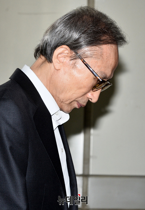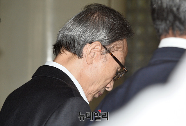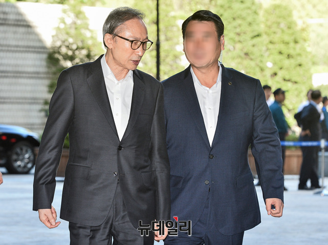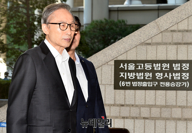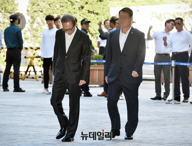 이명박 전 대통령이 23일 오전 서울 서초구 서울고등법원에서 열린 항소심 속행 공판에 출석하기 위해 법정으로 향하고 있다.